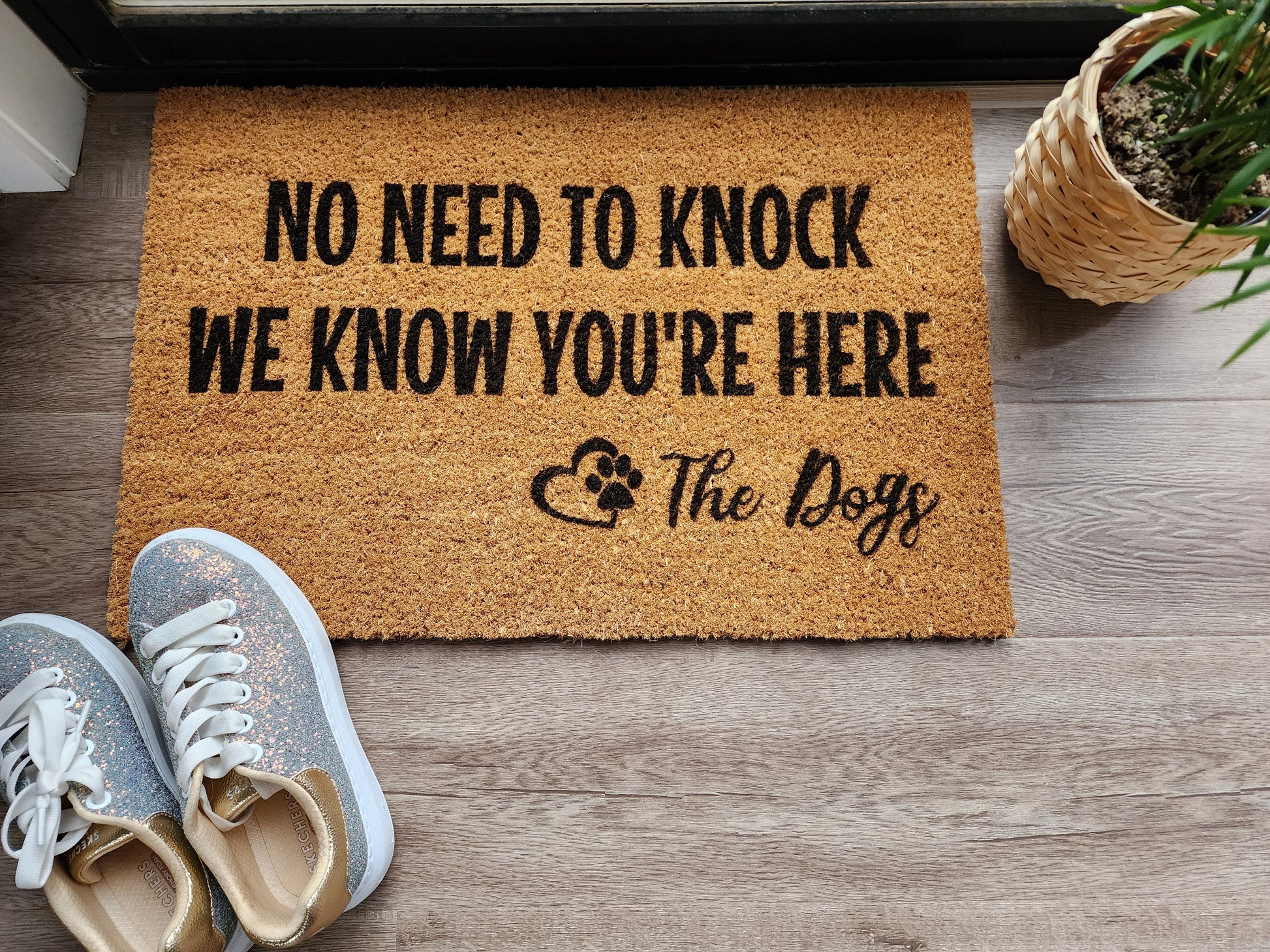 NO NEED TO KNOCK WE KNOW YOU'RE HERE THE DOGS CUSTOM DOOR MAT